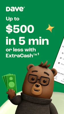 1-Dave is not a bank. Banking services provided by Evolve Bank and Trust, Member FDIC, or another partner bank, which issues the Dave Debit Card through a license from Mastercard®. ExtraCash amounts range from $25-$500, typically approved in 5 min, with an overdraft fee equal to the greater of $5 or 5%. Multiple overdrafts may be required. Not all members qualify for ExtraCash and few qualify for $500. ExtraCash is repayable on demand. Must open an ExtraCash overdraft deposit account and Dave Checking account. Up to $5 monthly membership fee for ExtraCash, Income Opportunity Services, and Financial Management Services. Optional 1.5% fee for external debit card transfers.