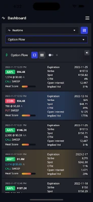 - Stock options (highlighted for unusual activity and urgency) - Dark pool and equity prints - Actionable charts - Automated technical analysis - On-Demand Historical Data - Custom watchlist - One-click filtering - Real-time with sentiment