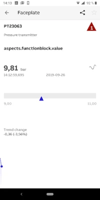 Values are received from the connected ABB DCS in near real-time. A trim curve visualizes the changes of a process value over time. Most frequently used DCS objects can be easily retrieved from a list of recent items or can be added to favorites. The App includes faceplate view, alarm list and alarm notifications with sharing functionality to support field operators making decision anywhere anytime.