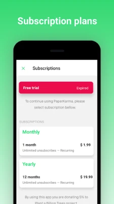 In-app purchase subscription required to use the PaperKarma app beyond the free trial. All users are granted 4 free requests to unsubscribe from postal junk mail, and will be prompted to choose a subscription plan when submitting their fifth request. Subscription plan options include a recurring monthly plan, a 6 month plan, or a yearly plan. We are now offering a Lifetime Plan also, which is a 1-time purchase for lifetime access to the PaperKarma app (unlimited unsubscribe requests).