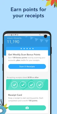 Snap a photo in the Receipts tab to submit your paper receipts. 4 valid receipts fill up one green Point Card.