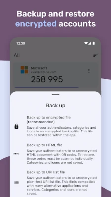 - 💾 Backup / Restore: Backup your authenticators with strong encryption. In case you lose or change your phone, you can always gain access to your accounts. You can save backups to cloud storage or to your device.